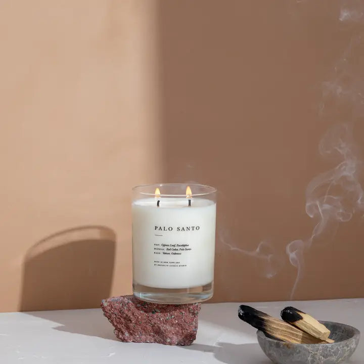 Since the Incan era, the fragrant wood has been ritualistically burned to cleanse a space of bad energy, and the oil is said to have purifying and healing properties. Our rendition features calming top notes of cedar and mint, middle notes of cypress, and eucalyptus, and warm base notes of sandalwood and amber. This candle is infused with eucalyptus, peppermint, and cedarwood essential oils. Our Classic 2-Wick Candles come in scents inspired by travel and nature, moments and olfactory memories: fig trees in Greece, late nights in Brooklyn, early mornings at the farmers' market.