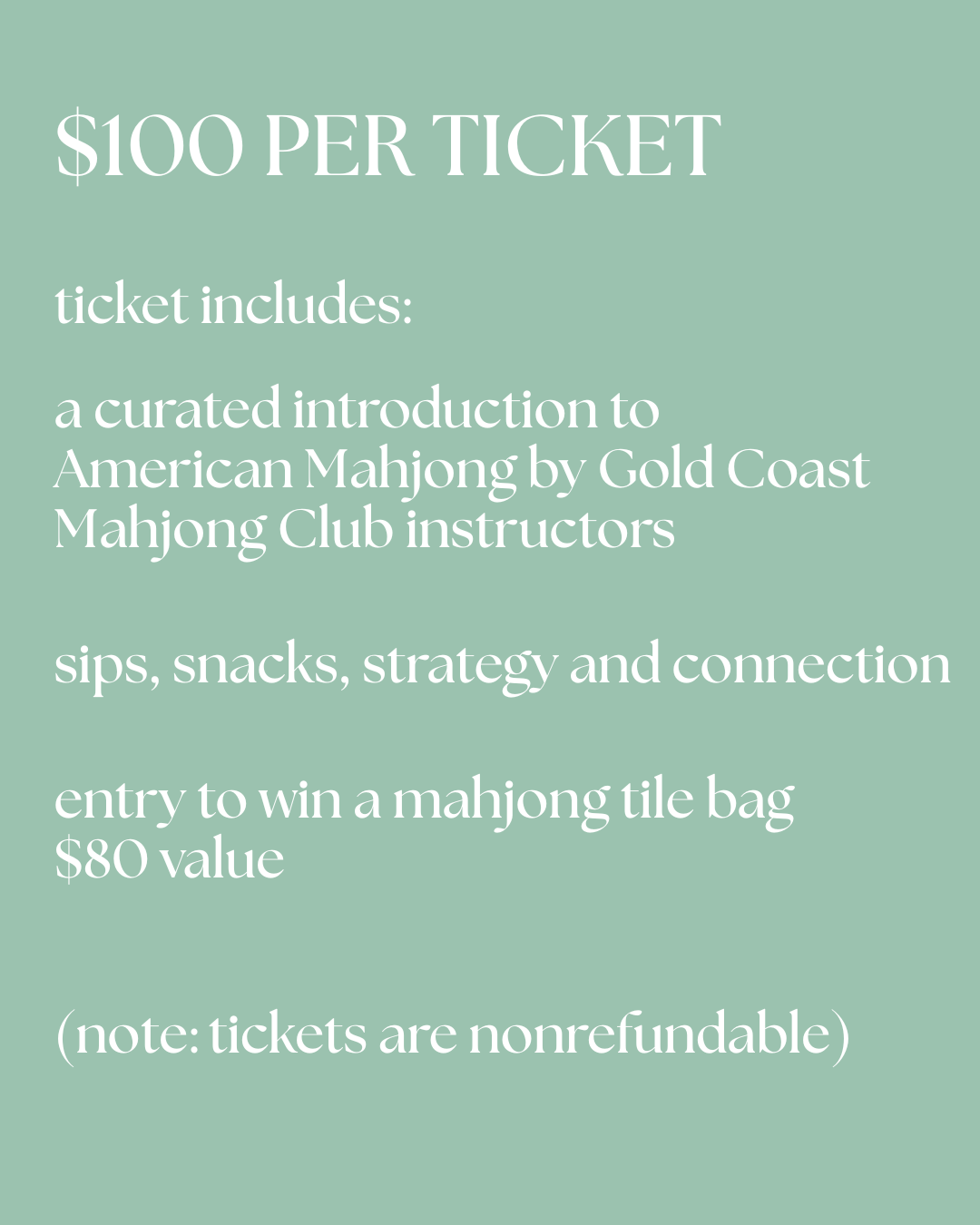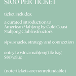 Tickets include instructional lessons on the basics of American Mahjong with a trained instructor. Enjoy drinks and snacks as you learn to play the hottest new game. Your ticket also gets you entered to win our Mahjong gift raffle of a Oh My Mahjong tile bag, valued at $80. Grab some girl friends and let's have some fun! MARCH 22 2:00-4:00pm, tickets are non-refundable